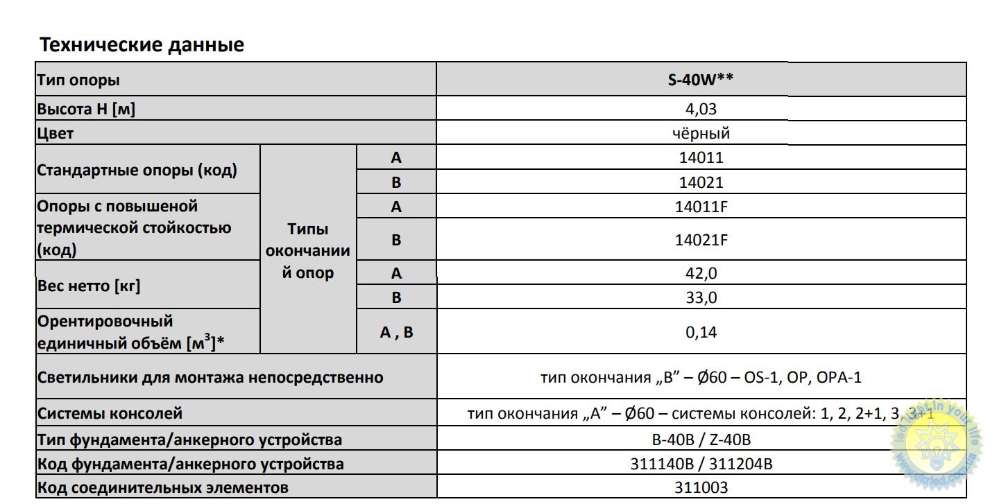 | Название товара (артикул) | парковая опора декоративная S-40W |